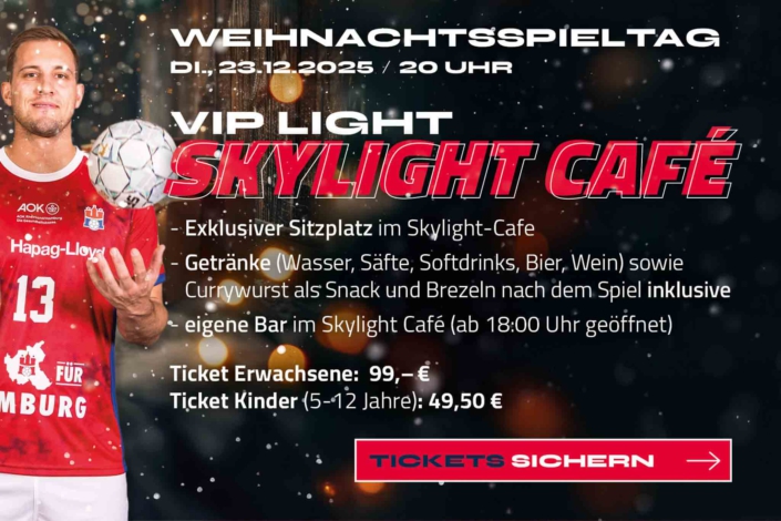 Zum Weihnachtsspiel am 23.12. gegen den amtierenden Deutschen Meister Füchse Berlin öffnet das Skylight Café im Oberrang mit eigener Bar wieder seine Türen. Mit dem VIP-light-Angebot sind alle Getränke (Wasser, Softdrinks, Bier, Wein) sowie Currywurst und Brezen inklusive. Tickets gibt es bereits für 99€ pro Person. Kinder (5-12 Jahre) zahlen 49€.