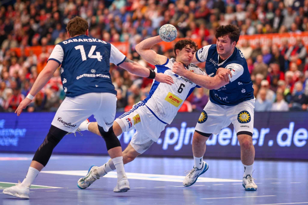 Die Anfangsphase verlief sehr ausgeglichen: Der Bergische HC hatte Anwurf – und machte durch Fynn Hangstein das erste Tor. Frederik Bo Andersen traf von Rechtsaußen für Hamburg direkt zum Ausgleich. Allerdings leisteten sich die Gastgeber zu Beginn viele Ballverluste, sodass man schnell – nach einem Treffer von Sören Steinhaus – einem 2:4-Rückstand hinterherrennen musste. Als Niklas Weller nach 7:30 Minuten dann auch noch eine Zeitstrafe kassierte, konnte einem angst und bange um die Hamburger werden. Lars Mitchell Kooij erhöhte später auf 12:9, sodass HSVH-Coach Torsten Jansen eine Auszeit nahm. Die zeigte Wirkung: Kaj Geenen verkürzte auf 12:13. Am Ende der ersten Hälfte hieß es nach einem Tor des Niederländers 17:18.